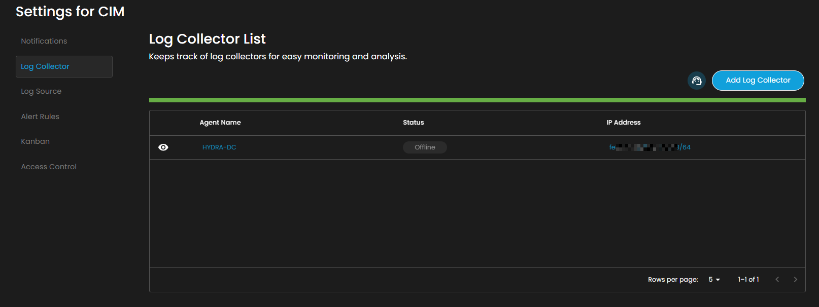 The Log Collector List interface provides administrators with a centralized view for managing and monitoring log collectors. This section is part of the Settings for CIM (Cyber Incident Management) module and enables easy configuration, visibility, and operational control of log collectors.