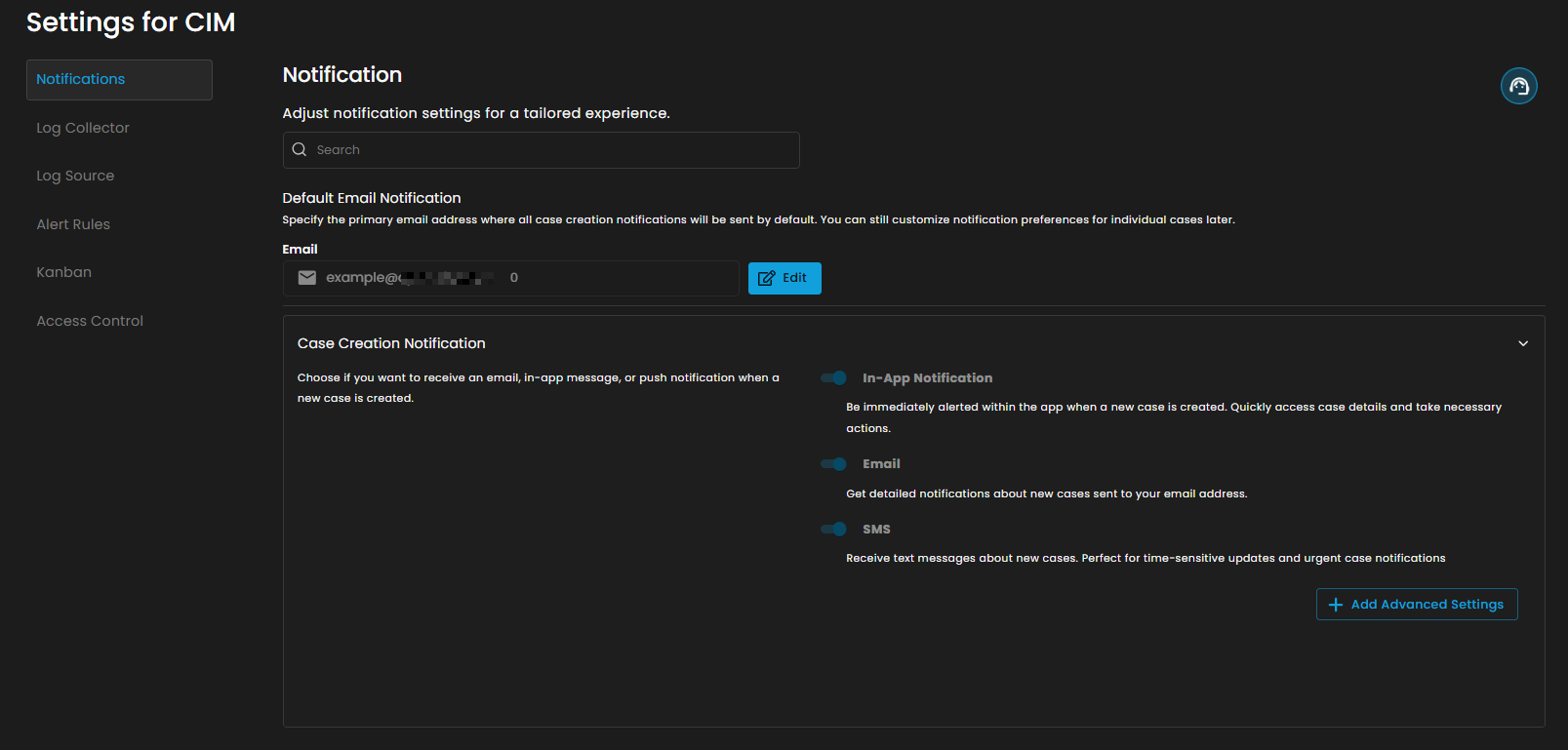 This page allows users to configure and manage notification settings within the CIM (Cyber Intelligence Management) solution. The interface is organized into multiple sections for streamlined navigation and tailored notification management.