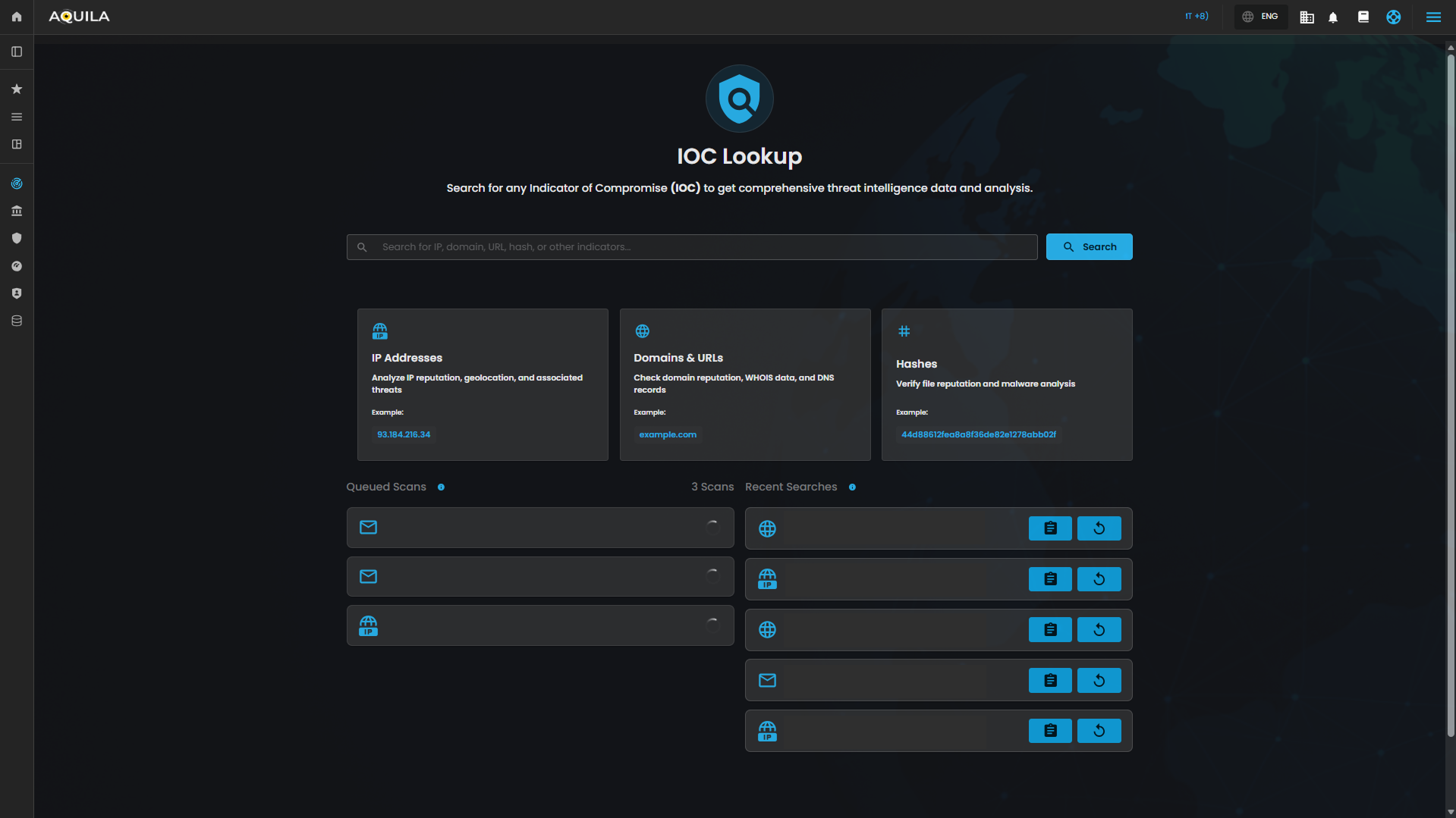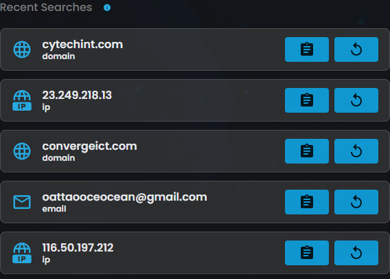 - This section shows a list of the most recent IOC lookups performed. It offers quick access to previously searched indicators, allowing for easy reference or reanalysis if needed.