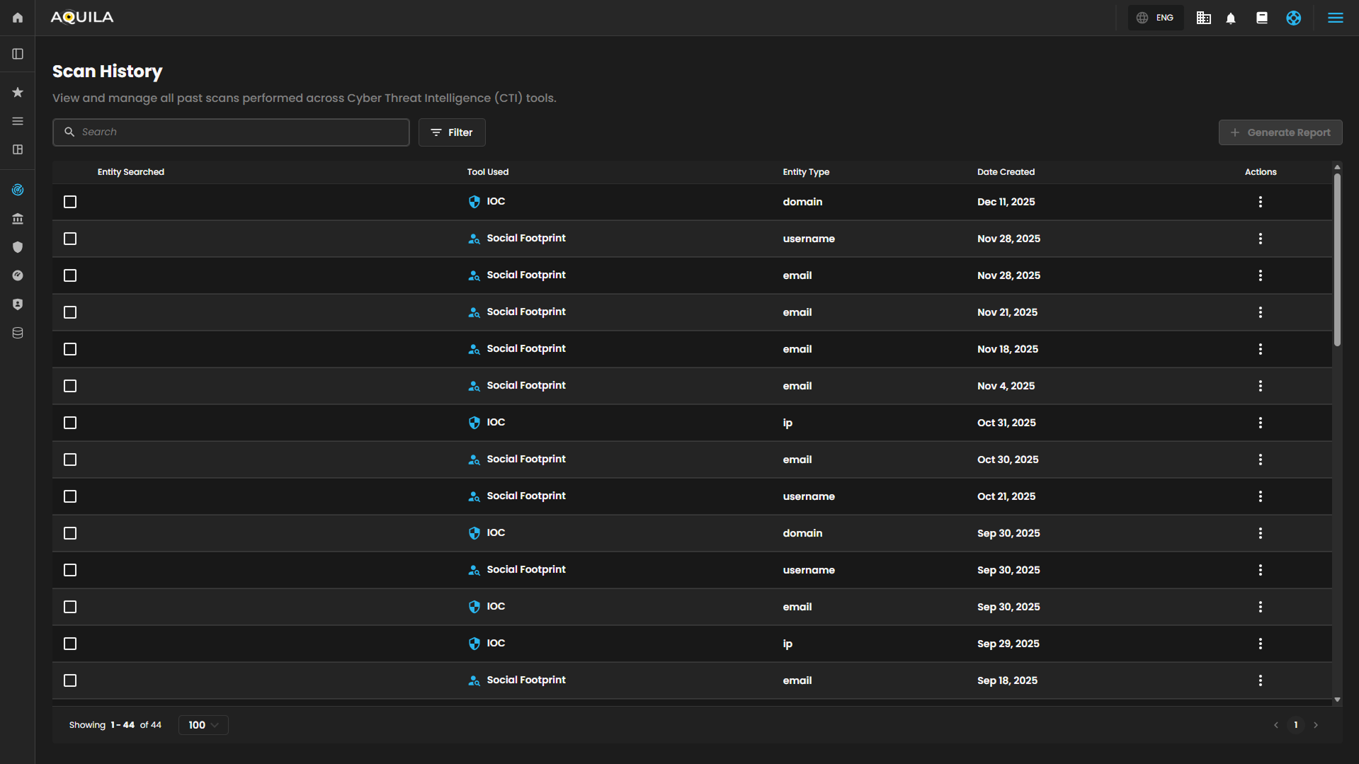 The Scan History widget is designed to display and manage all past scans performed across Cyber Threat Intelligence (CTI) tools. This feature allows for easy review of historical scans related to various entities, such as emails, domains, usernames, and more.