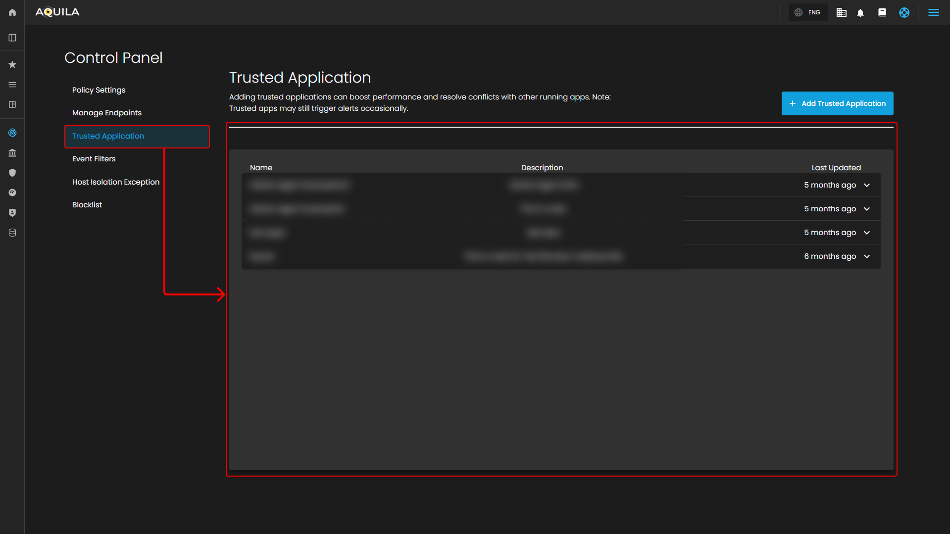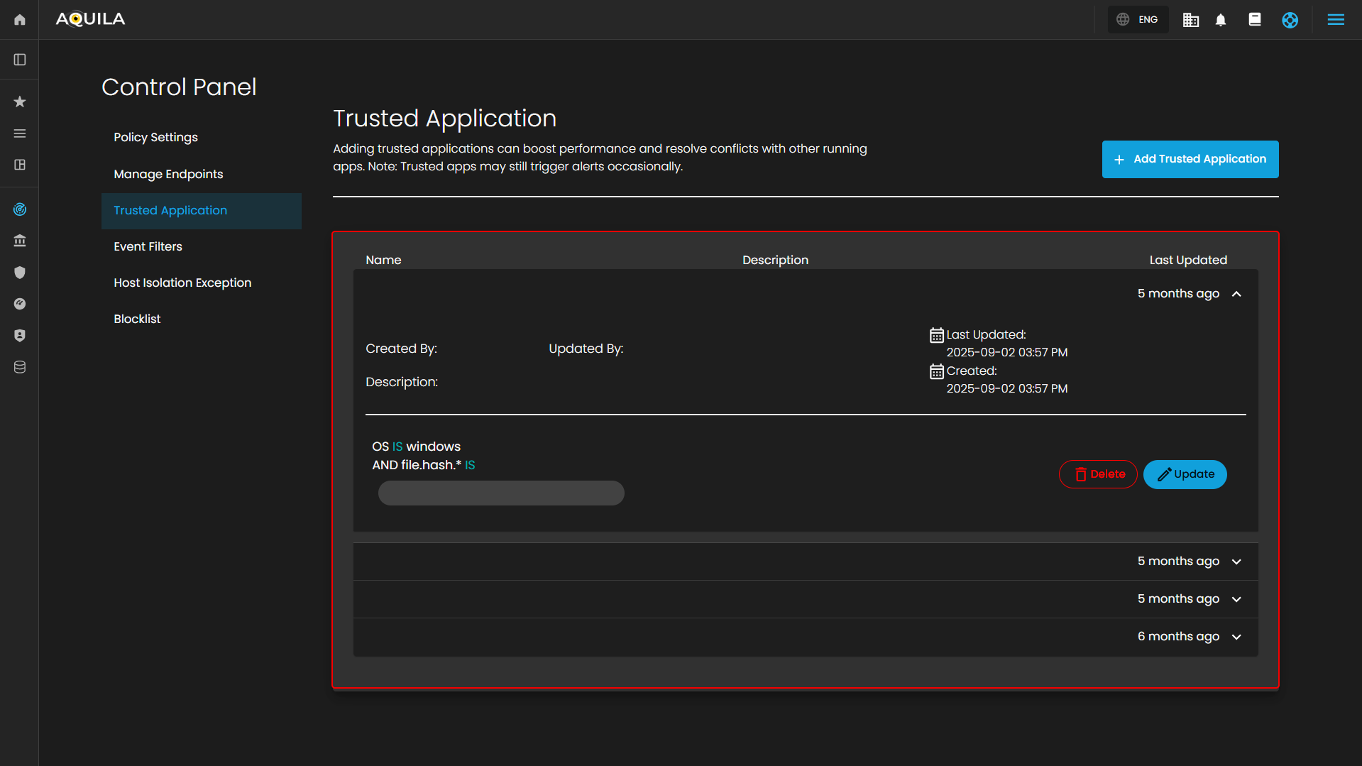 In the Trusted Application Page, you can see an overview of your organization's trusted applications. This section includes the names of the applications, their descriptions, and the last updated time. Currently, there are several trusted applications listed, such as "AQUILA Agent Exception" and "test app2."
