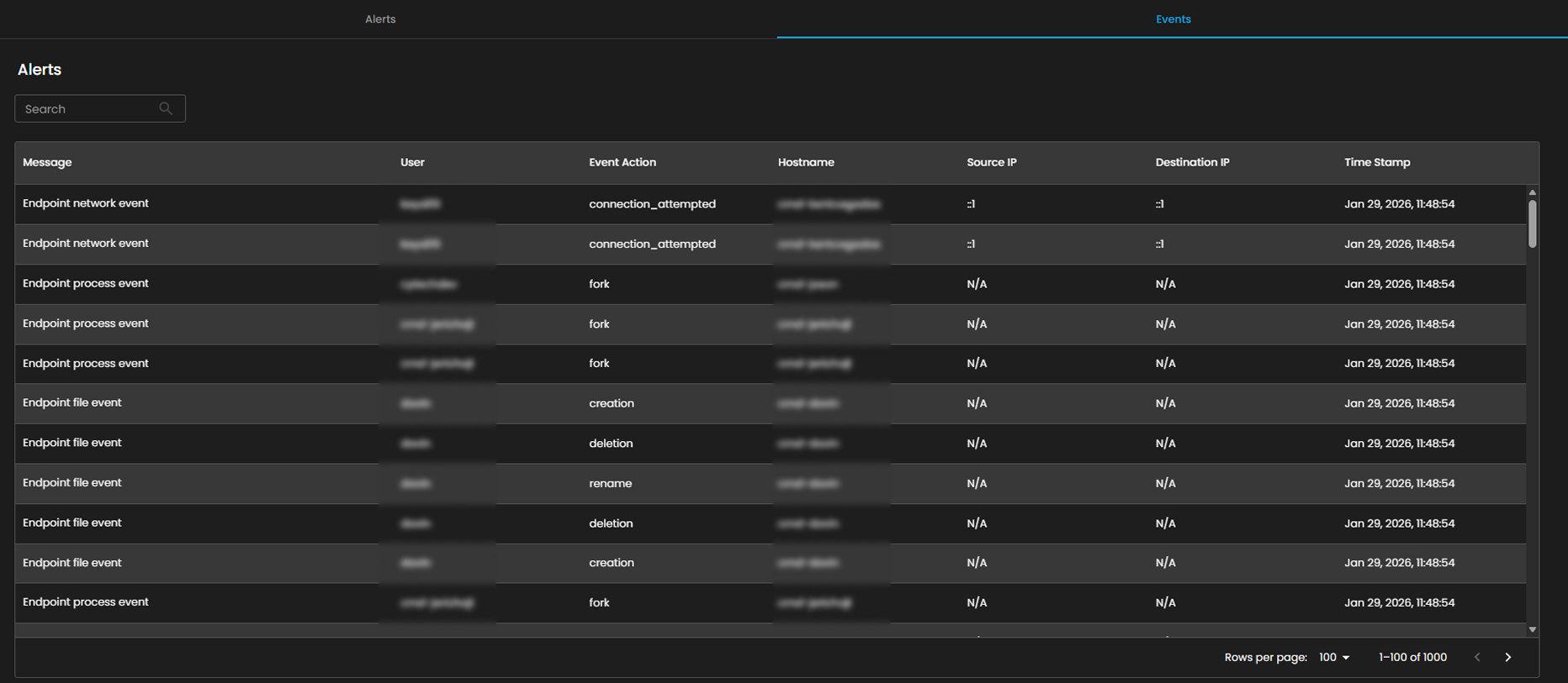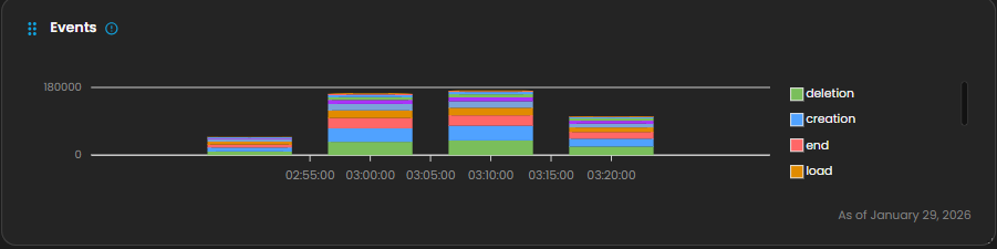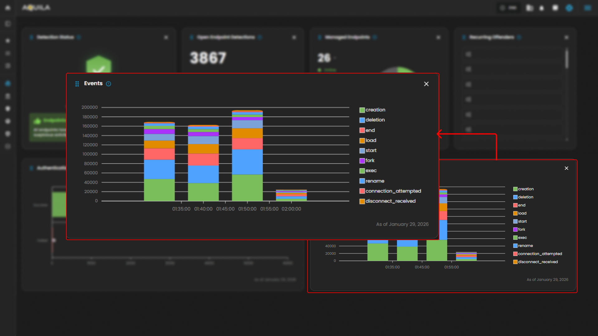 The Events graph visualizes system activity, with each color representing different types of events like “end,” “fork,” “exec,” and “creation.” This graph provides insights into endpoint activity over time, showing fluctuations between 09:00 and 09:45 AM. For example, we can see spikes in events at certain times, allowing you to quickly identify periods of increased activity.