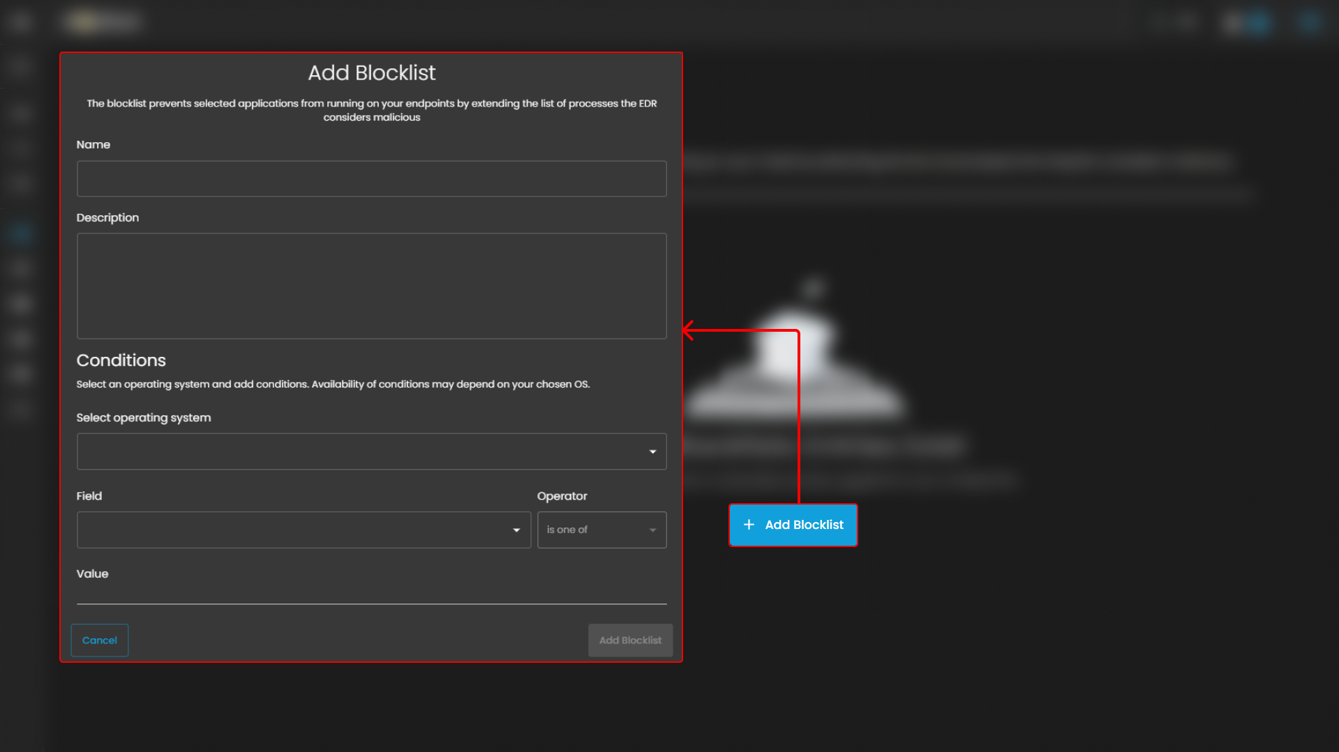 - When adding a new blocklist entry, a popup window appears allowing you to set up the entry. In this window, you can enter the Name of the entry and an optional Description. You can also define the Conditions by specifying the application and other criteria that should be blocked on your endpoints.