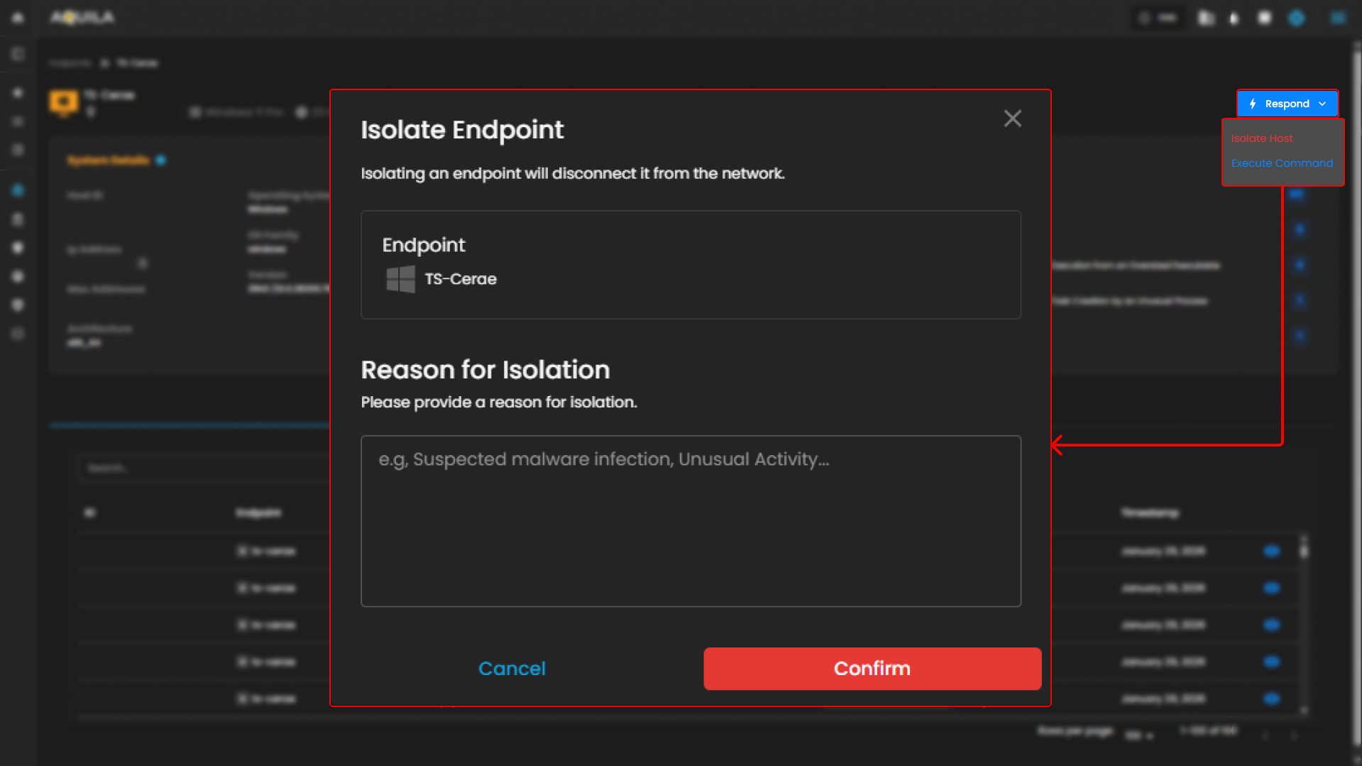 The client can select Respond button to isolate the host or initiate a command prompt. In this section when pressing the Isolate Host, a window will pop up asking for a Reason for Isolation.