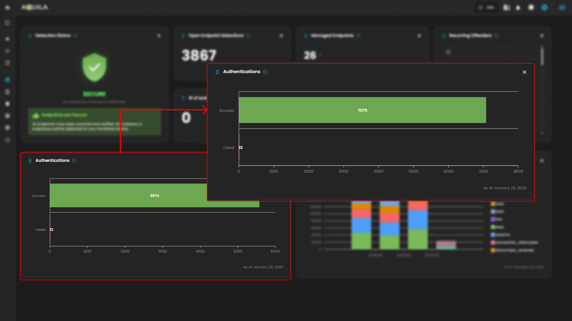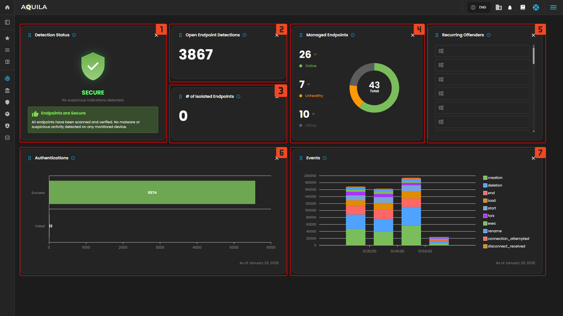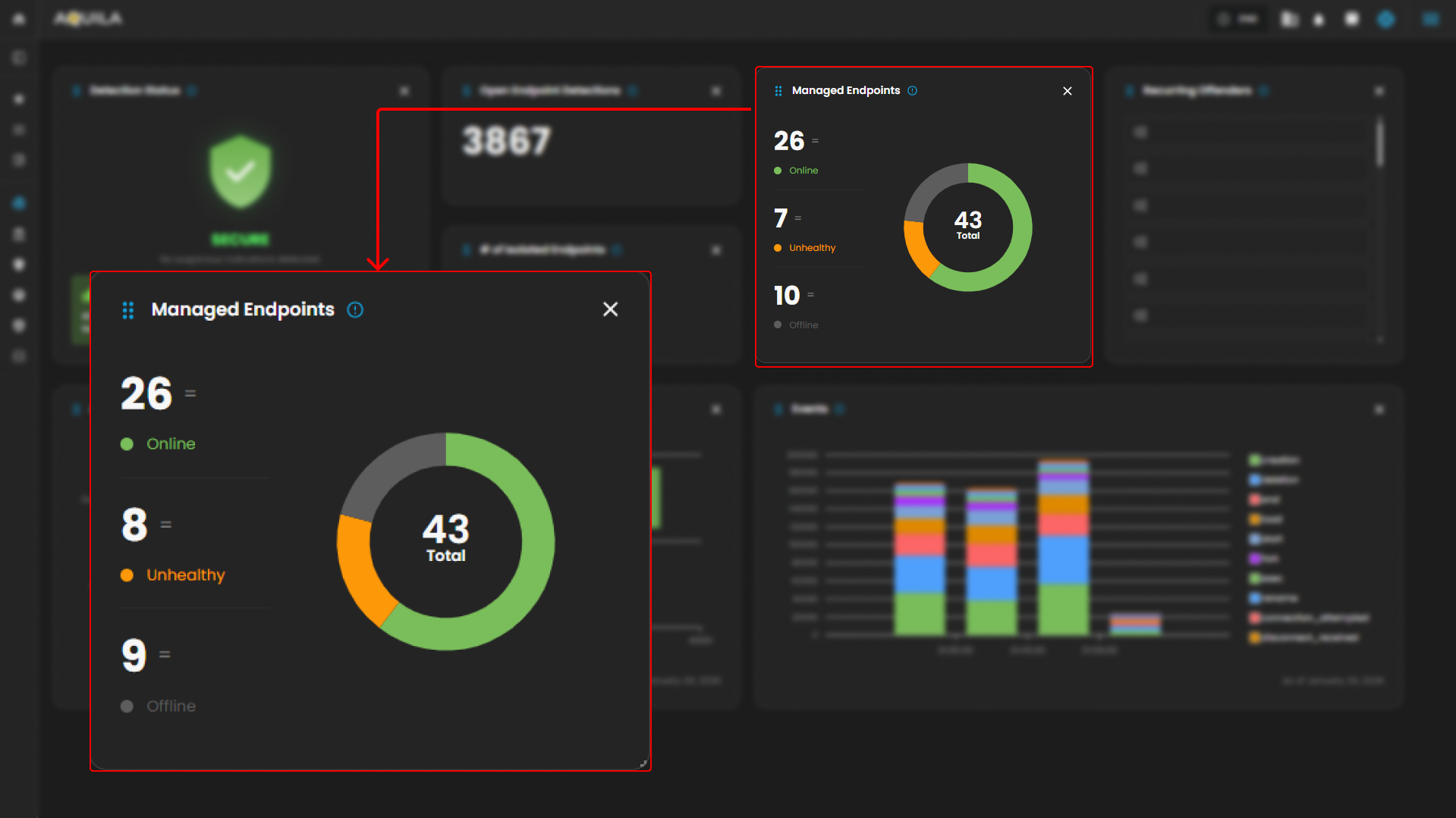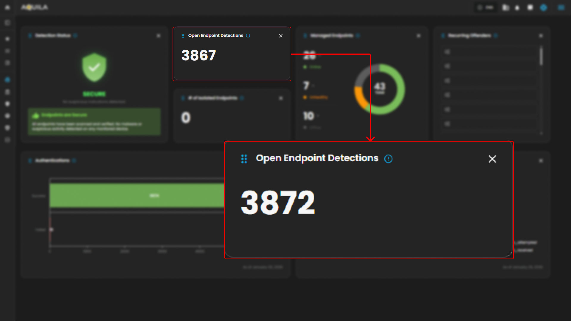 In the EDR Module Dashboard, you can monitor the security status of endpoints at a glance. This includes Detection Status, Endpoint Health, Authentication Attempts, Event Activity, and Recurring Offenders.