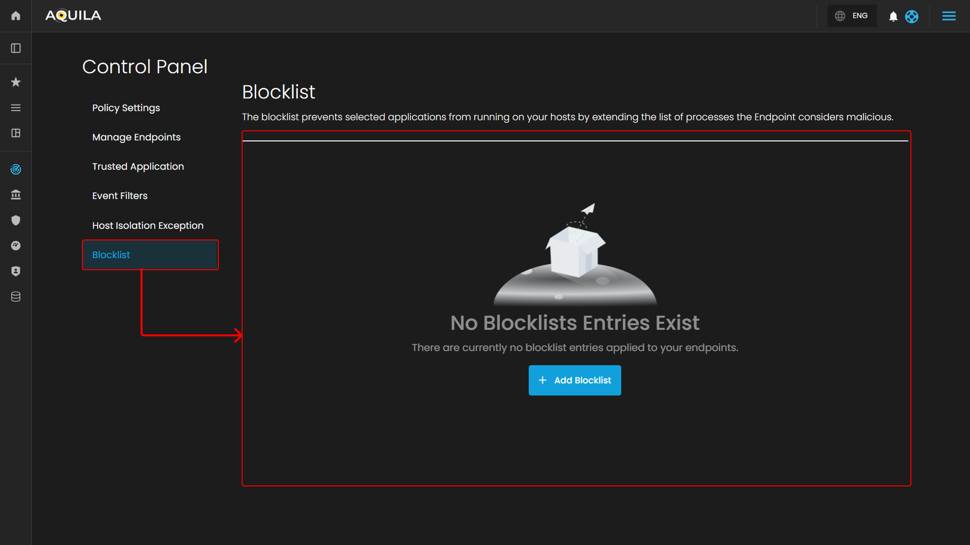 In the Control Panel, you can manage various security settings and configurations for your organization’s endpoints. This section gives you access to several tools for managing Policies, Manage Endpoints, Trusted Applications, Event Filters, Host Isolation Exception and Blocklist. The control panel helps streamline the process of securing and monitoring endpoints, providing easy access to the most critical settings.
