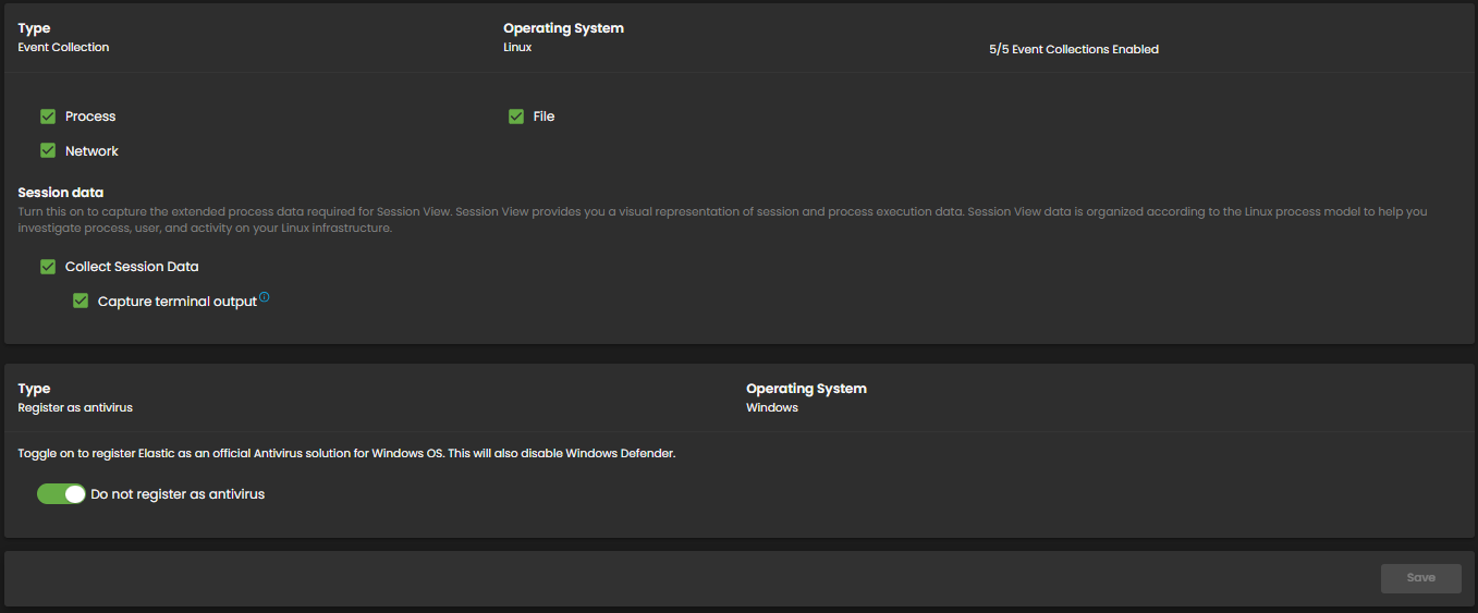 - In the Policy Settings section, you can manage and view all the security policies set for your organization's endpoints. This section allows you to control and configure various protection levels for different types of security threats. Policies can be applied to endpoints based on their operating system (Windows, Mac, Linux), and enabling these policies can trigger alerts for the respective security events.