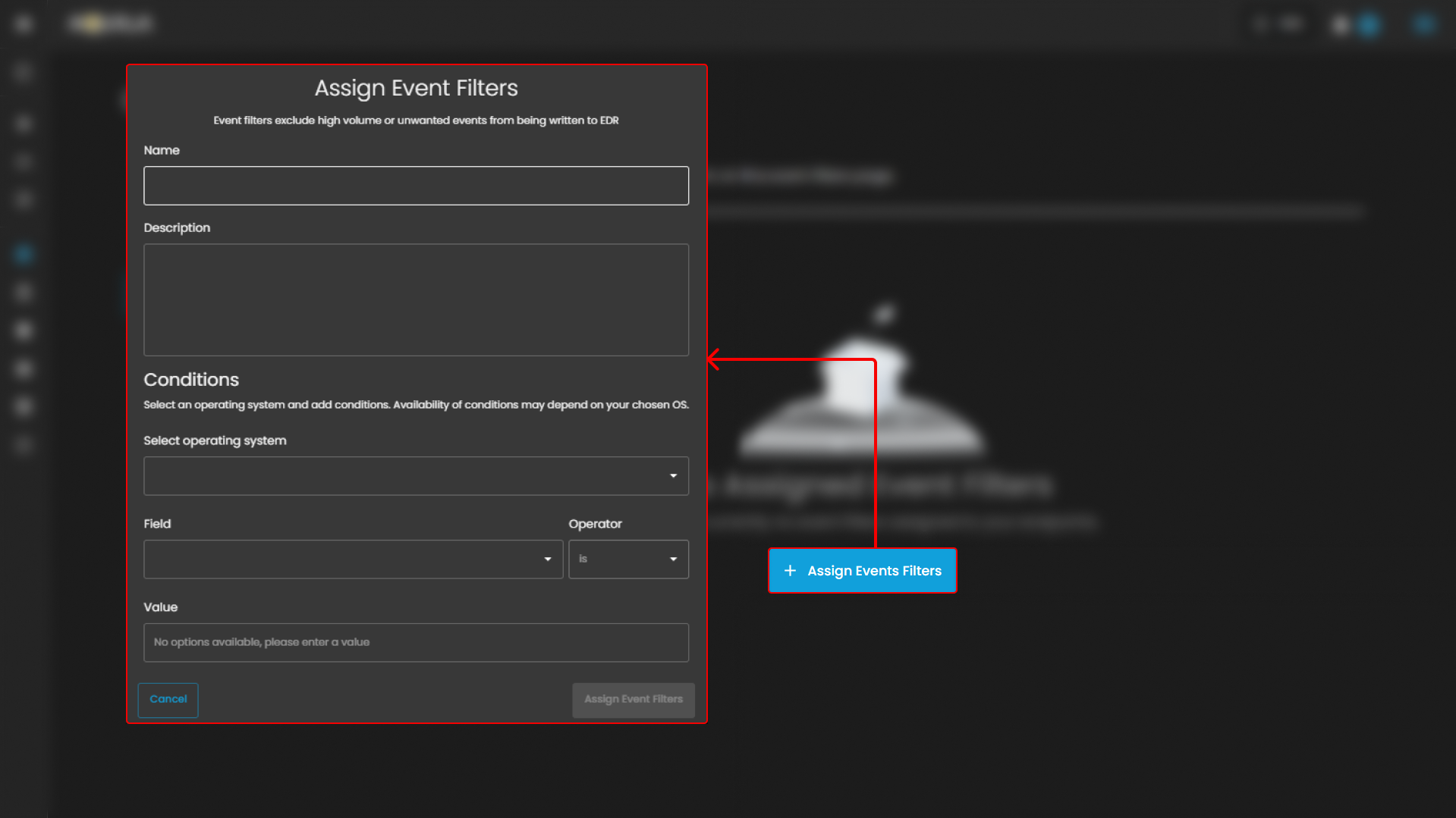 - This section allows users to configure filters that exclude high volume or unwanted events from being written to the EDR (Endpoint Detection and Response) system. It includes fields for the Name and Description of the event filter, both of which can be filled out with relevant details. Below that, the Conditions section lets you select an operating system and apply specific conditions using Field, Operator, and Value to filter events based on certain criteria.
