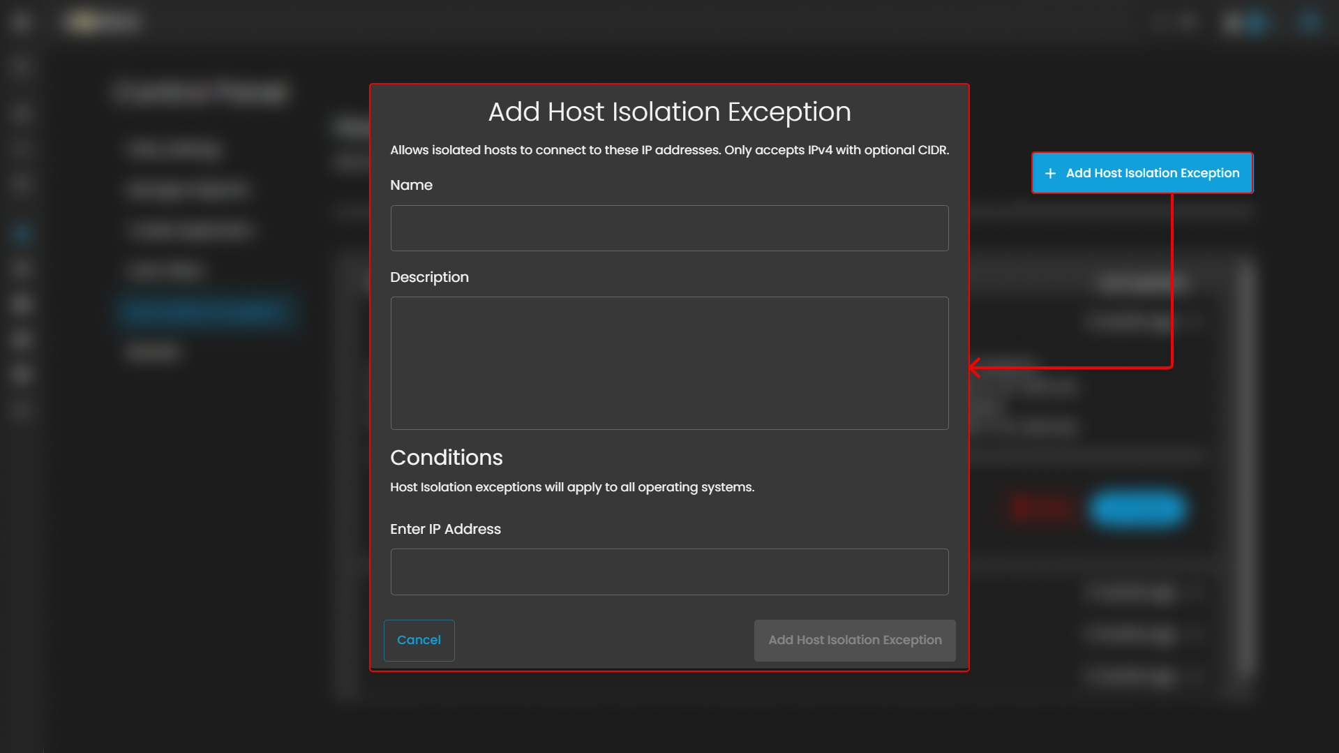 - This popup allows users to create exceptions for isolated hosts, enabling them to connect to specific IP addresses. It includes fields for the Name of the exception and an optional Description to provide additional details. Under Conditions, there is a field labeled Enter IP Address, where users can specify the IP addresses (IPv4, with optional CIDR) to which the isolated hosts are allowed to connect.