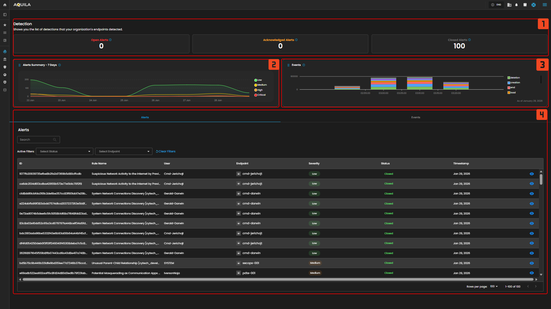 In the Detections, you can manage and analyze all detection and alert data. It includes an overview of open, closed, and acknowledged alerts, event activity trends, and detailed alerts with filtering capabilities.