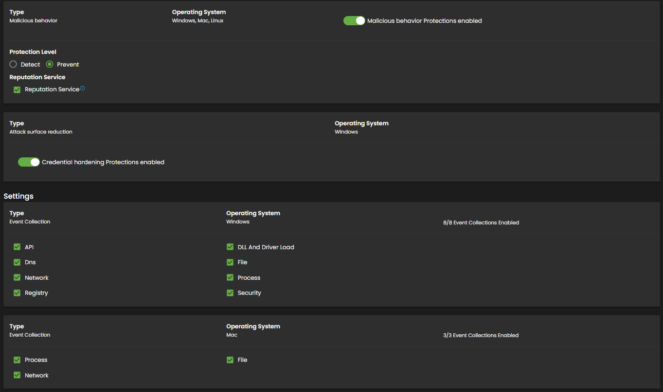 Malicious Behavior Protection: Enabled for all operating systems (Windows, Mac, Linux) with the same detection or prevention options.