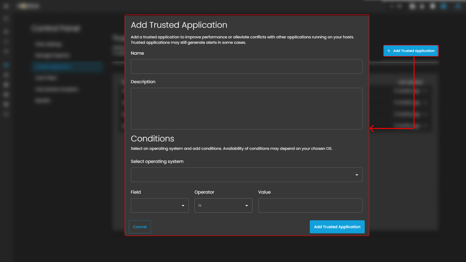 - This popup allows users to input the Name and Description of the trusted application. Additionally, it includes a Conditions section where you can select an operating system and specify conditions using fields, operators, and values. At the bottom, there are two buttons: Add Trusted Application to confirm the addition and Cancel to discard the action.