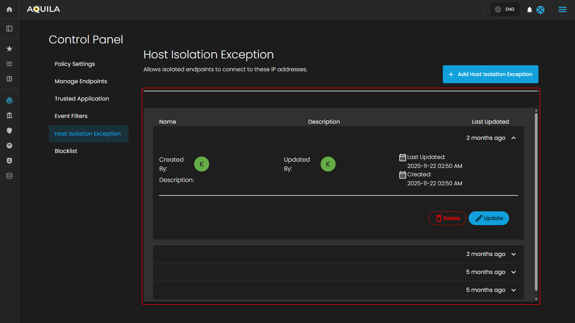 In the Host Isolation Exception Page, you can see the list of exceptions that allow isolated endpoints to connect to specific IP addresses. This section displays the names of the exceptions, their descriptions, and the most recent update times.