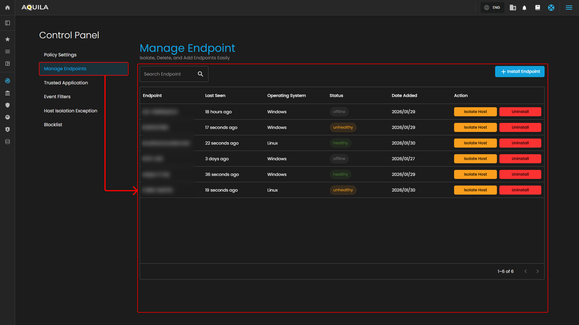 - In the Manage Endpoints Page, you can easily isolate, delete, or add new endpoints to your system. This section provides a quick overview of all your endpoints, including details like the endpoint name, last seen time, operating system, and status.