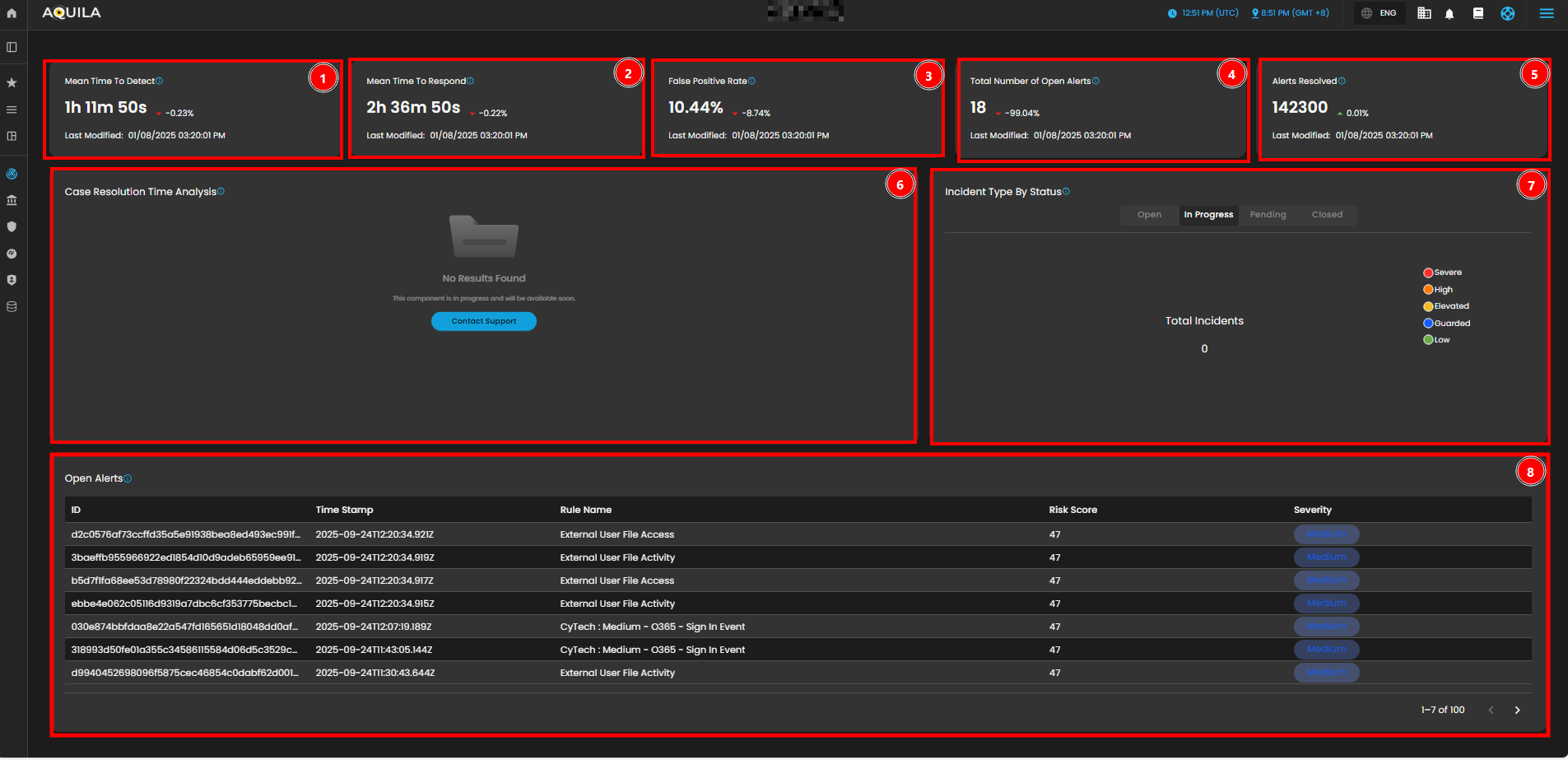 • Mean Time to Detect: Displays the average time taken to detect security incidents. Monitoring this metric helps evaluate the efficiency of the system in identifying potential threats.