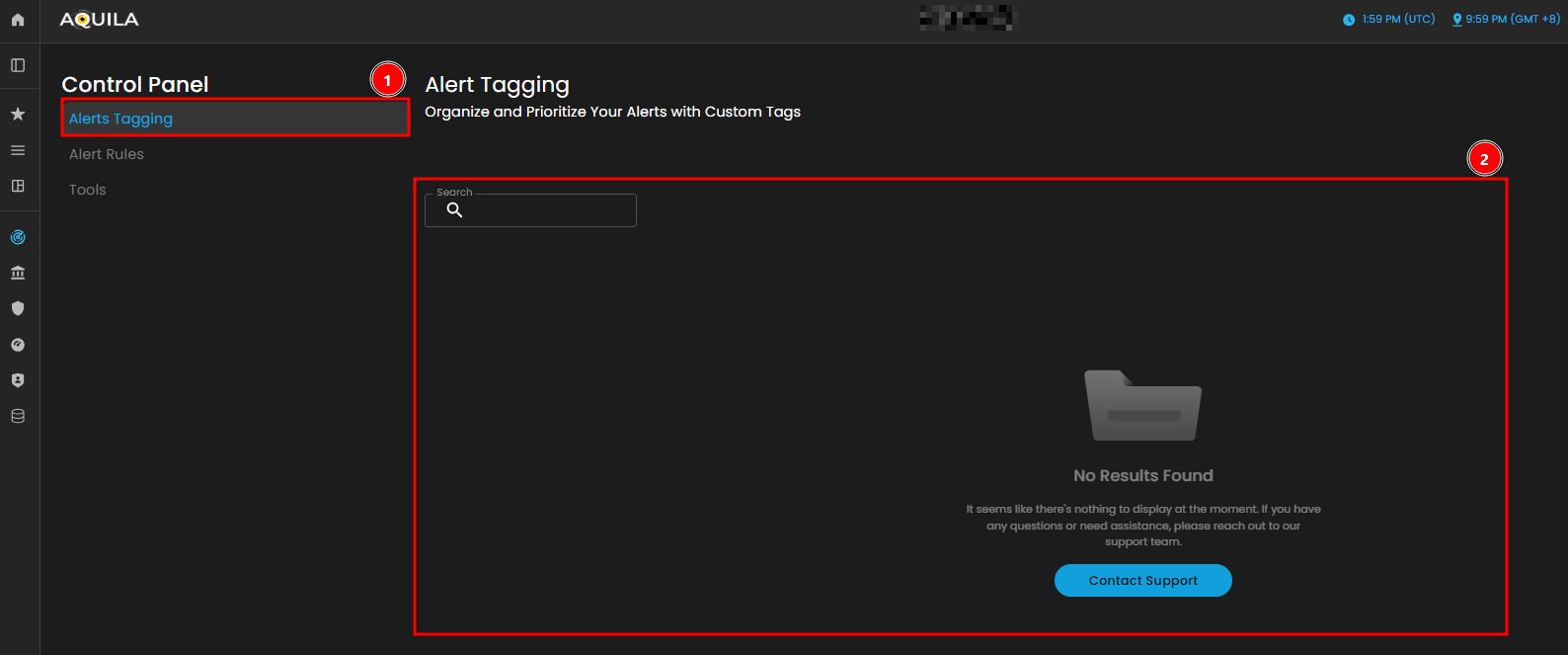 • This message indicates that there are no alerts or tags currently available or set. The prompt informs the user that there is nothing to display at the moment. If further assistance is needed, the user can click on the “Contact Support” button for help.