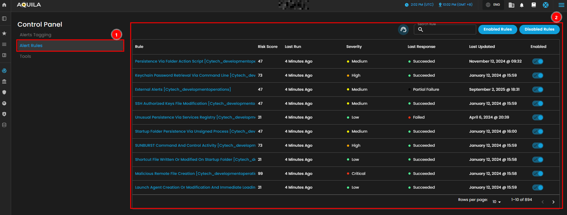The Alert Rules section in the Control Panel provides a comprehensive list of active detection rules. Each rule is associated with a specific alert or action that the system monitors. The table lists key details, such as the rule name, risk score, severity, and the status of the rule’s last response. This section also indicates whether the rule is currently enabled or disabled, with the option to toggle its status.