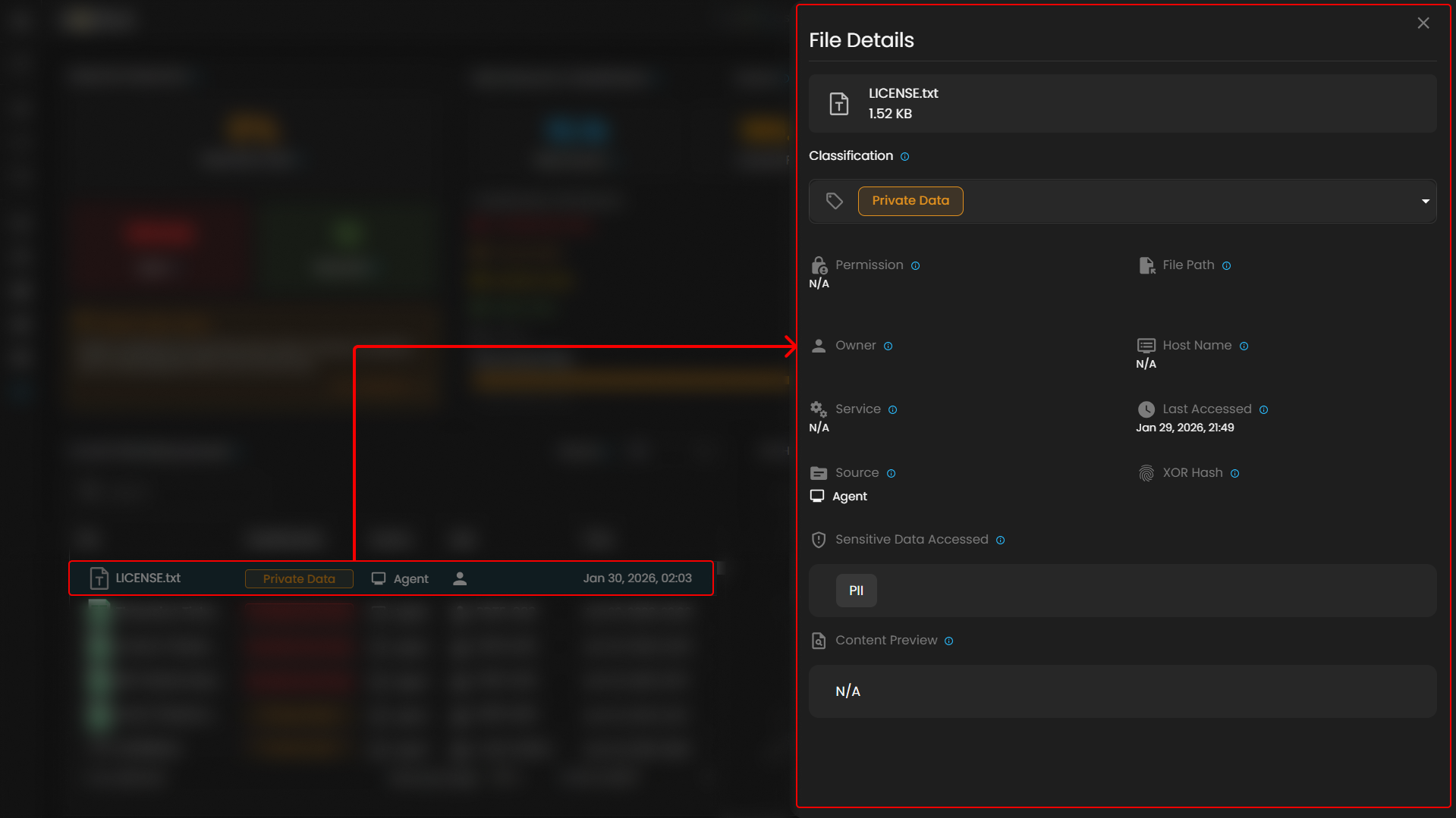 The File Details section provides key information about a monitored file, including its name, size, classification, and the last time it was accessed. It also shows details like the file’s permissions, owner, and location. If applicable, it can display which service the file is linked to, whether any sensitive data was accessed, and a content preview. This section helps users quickly understand the file's status and take necessary action if needed.