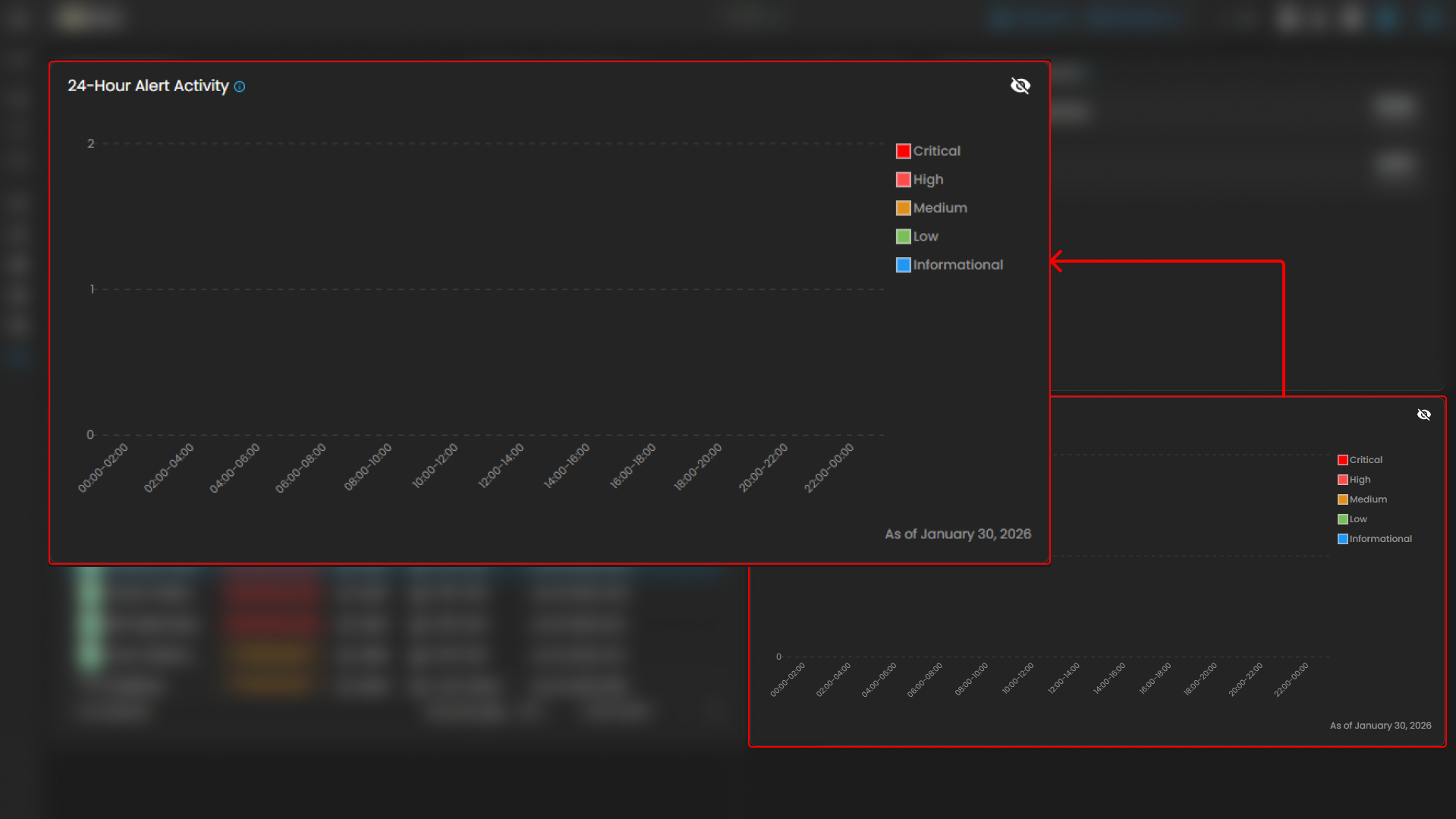 - 24-Hour Alert Activity: Offers a visual graph of alert activity over the past 24 hours, showing trends in severity and frequency to help users pinpoint critical incidents.