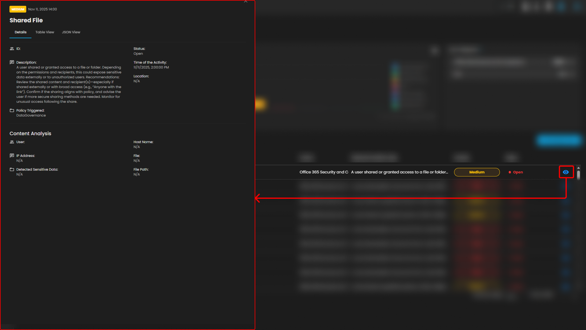 - This section shows the alert in-depth details like the description of the alert and its status, time of the activity and content analysis of the alert.