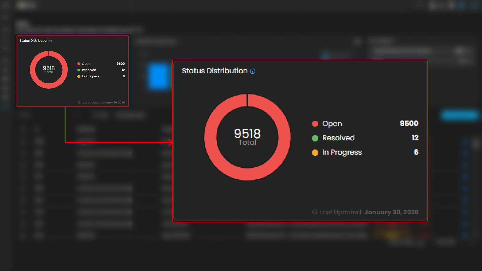 - Status Distribution: Provides a quick overview of the number of open, resolved, and in-progress alerts, allowing users to track the status of each alert type.