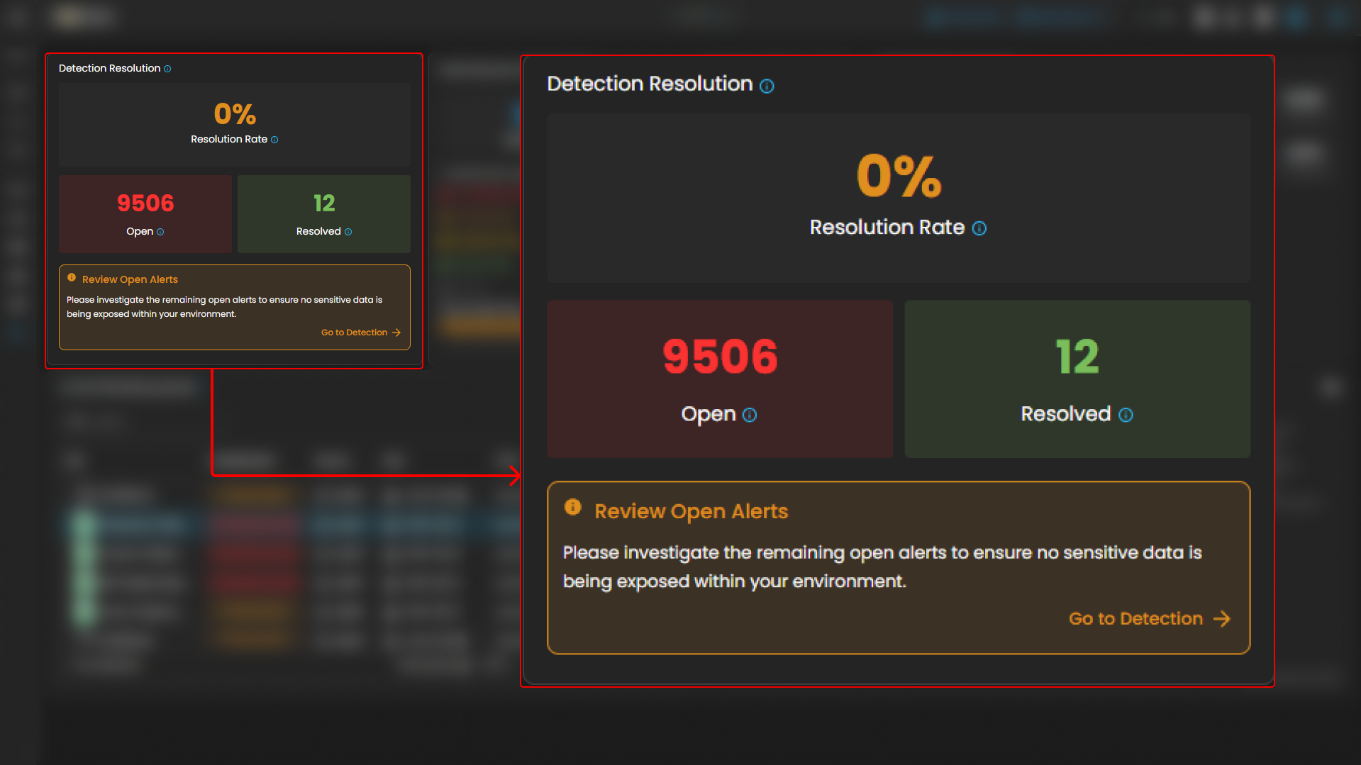 - Detection Resolution Overview: Displays the number of unresolved alerts and the overall resolution rate, providing a quick status of open security issues that need attention.