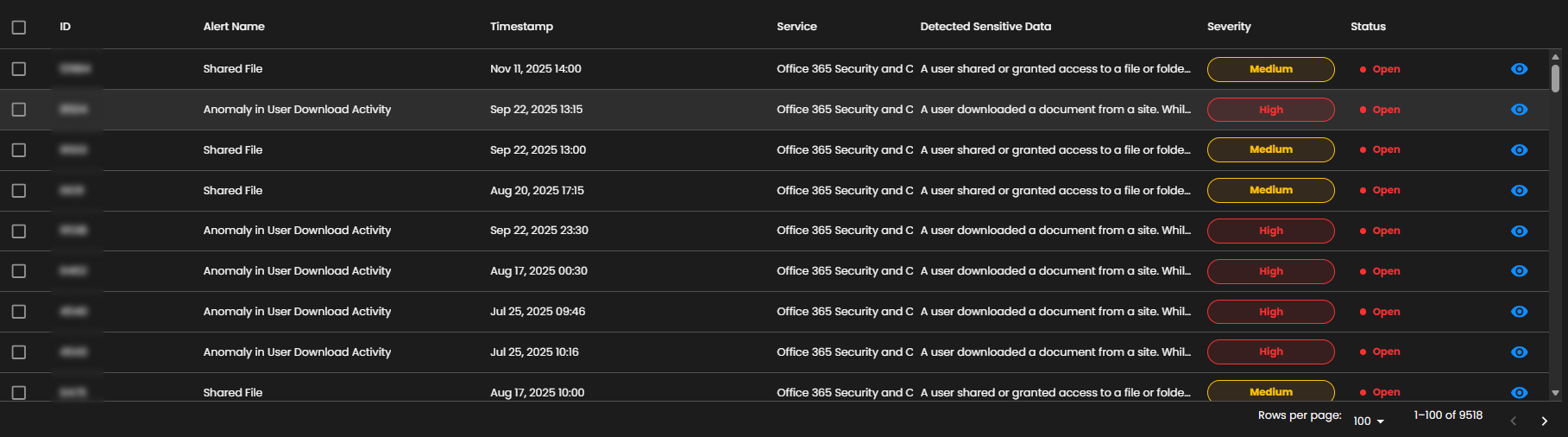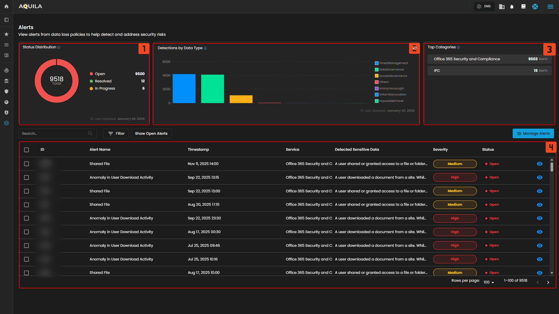 - Alert Categories: Organizes alerts by specific data types such as Data Governance, Threat Management, and Access Governance, helping users understand the context of each alert.