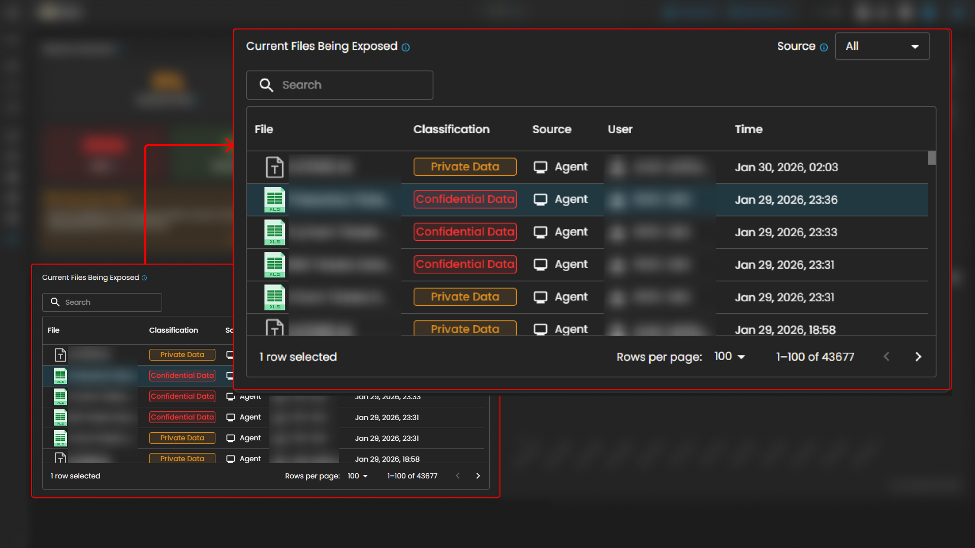 - Displays real-time visibility into sensitive or exposed files, including classification level, responsible user, and timestamp.