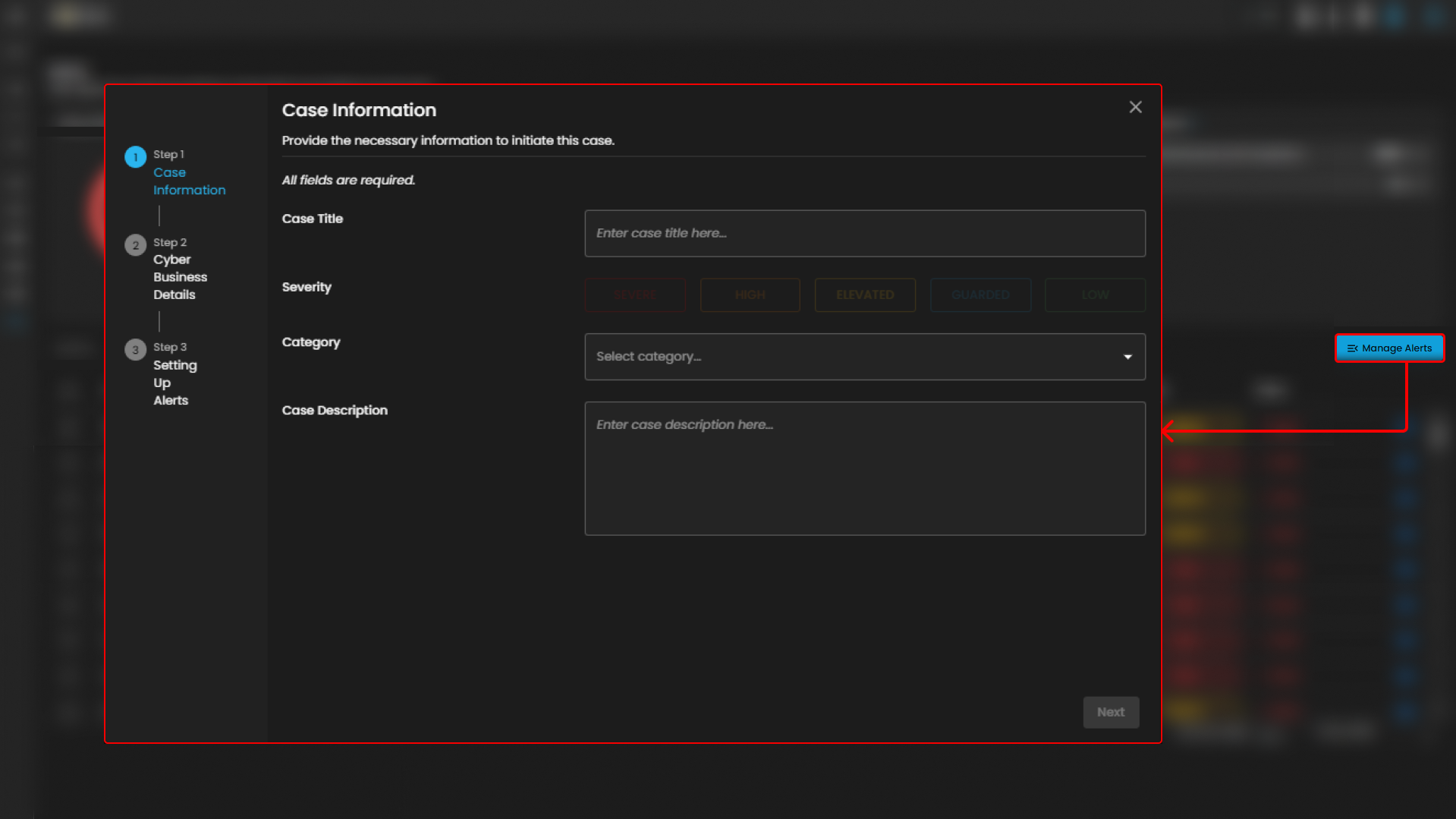 - In this section you can create a case through manage alerts, provide any necessary information regarding on the case you want to make, and it will be added here.
