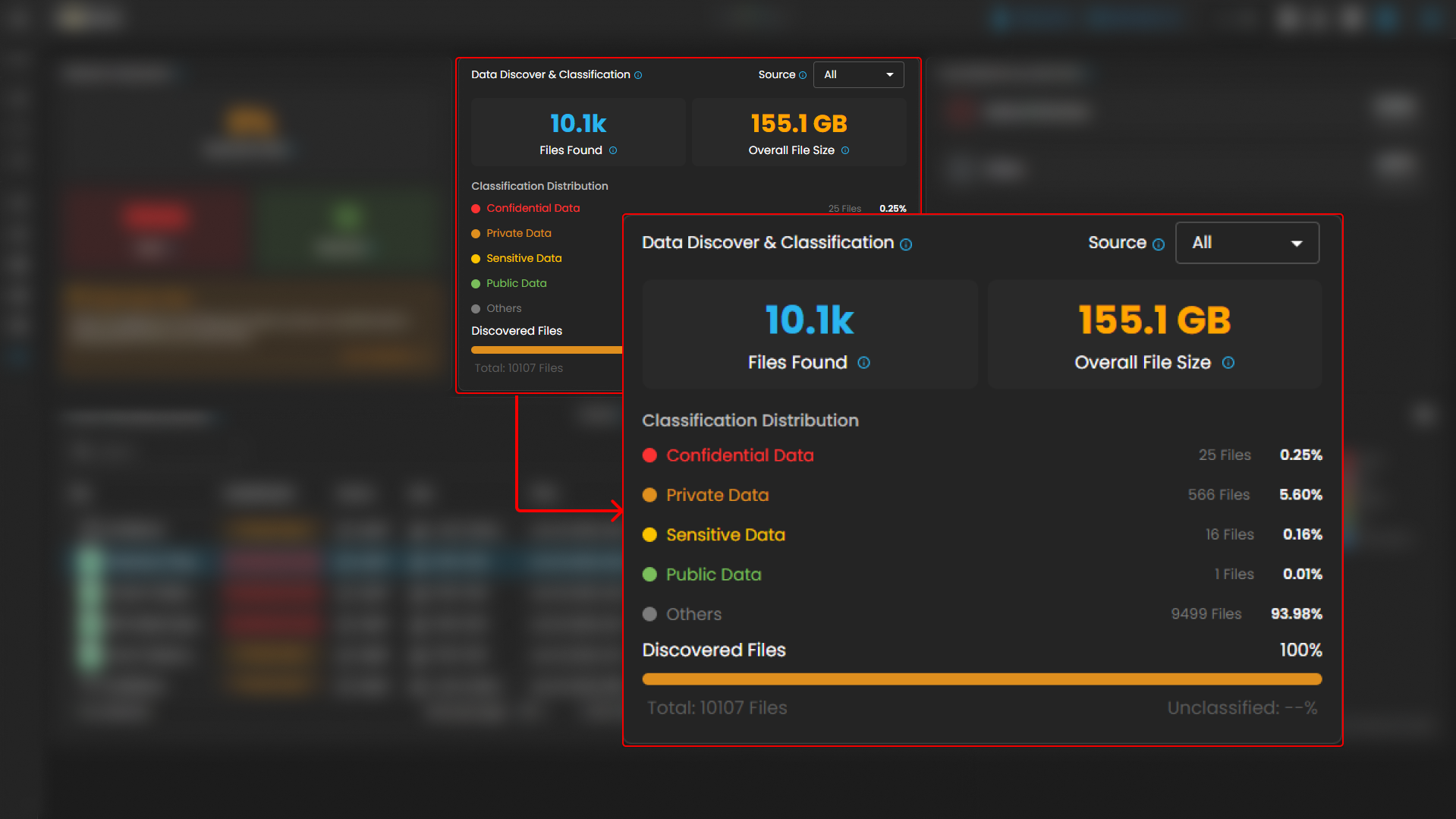 - Data Discovery & Classification: Shows the total number of files found and their classification (e.g., confidential, private, or public), helping users track how sensitive data is being managed and protected.