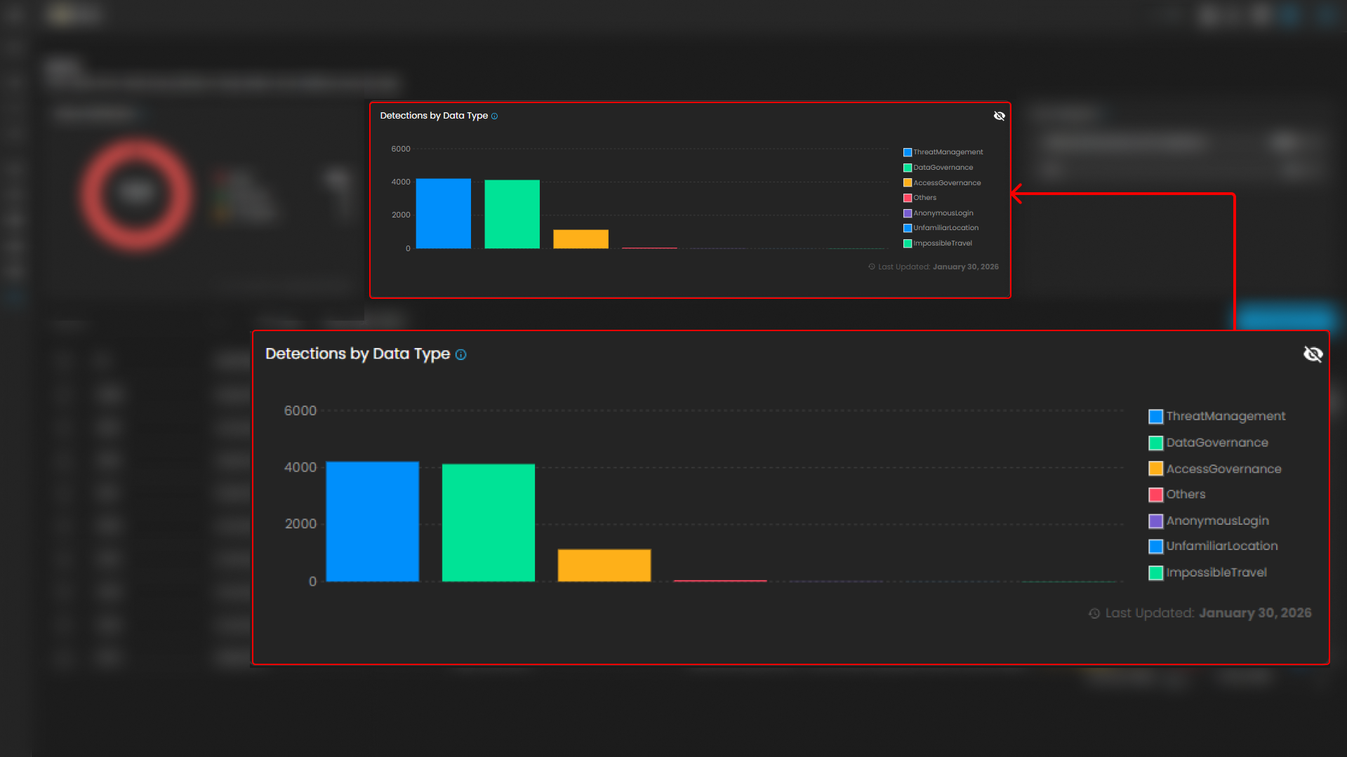 - Top Detection by Alert Rule: Highlights the most frequent detection rules, such as "External File Share," so users can focus on the highest-priority risks.