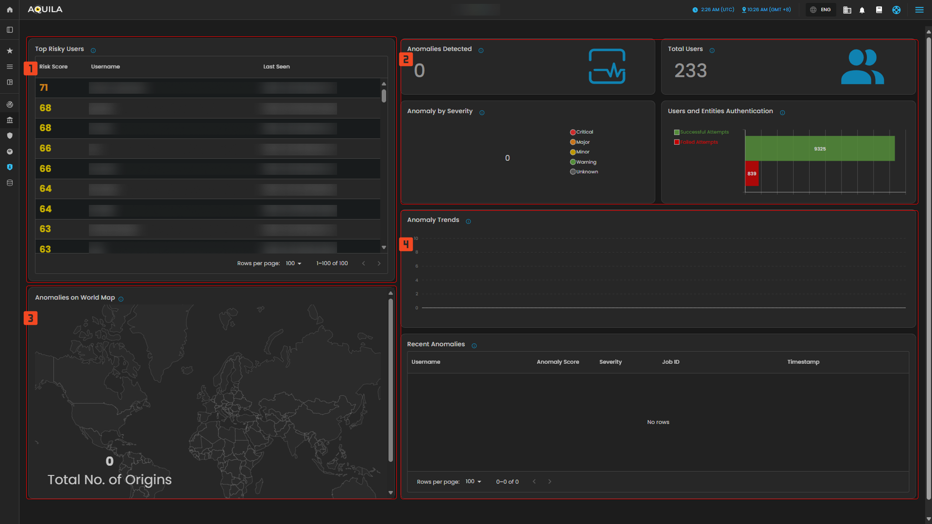 This dashboard is designed for monitoring user activity, identifying risky behavior, and tracking security-related anomalies. It provides key metrics, including the riskiest users, total user statistics, authentication attempts, and geographical distribution of anomalies. The current data shows no detected anomalies and a low number of failed authentication attempts.
