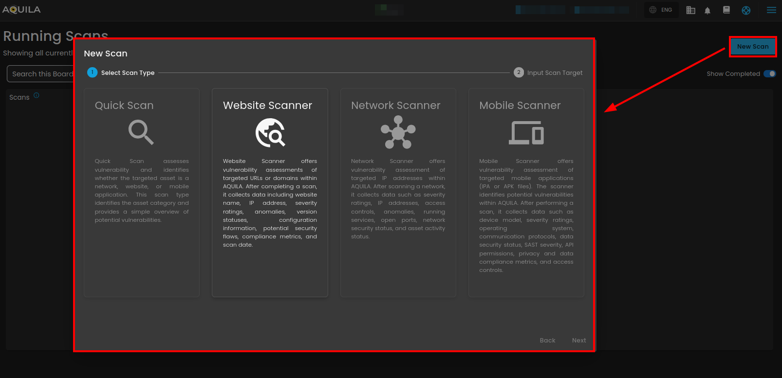 " New Scan " - The New Scan lets users choose the type of scan (Quick, Website, Network, or Mobile) depending on the asset being tested, each tailored to identify vulnerabilities and provide security insights.