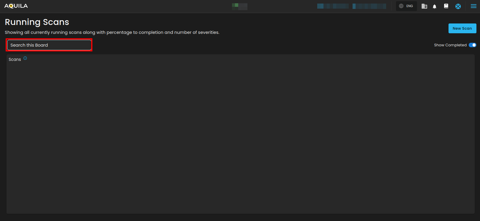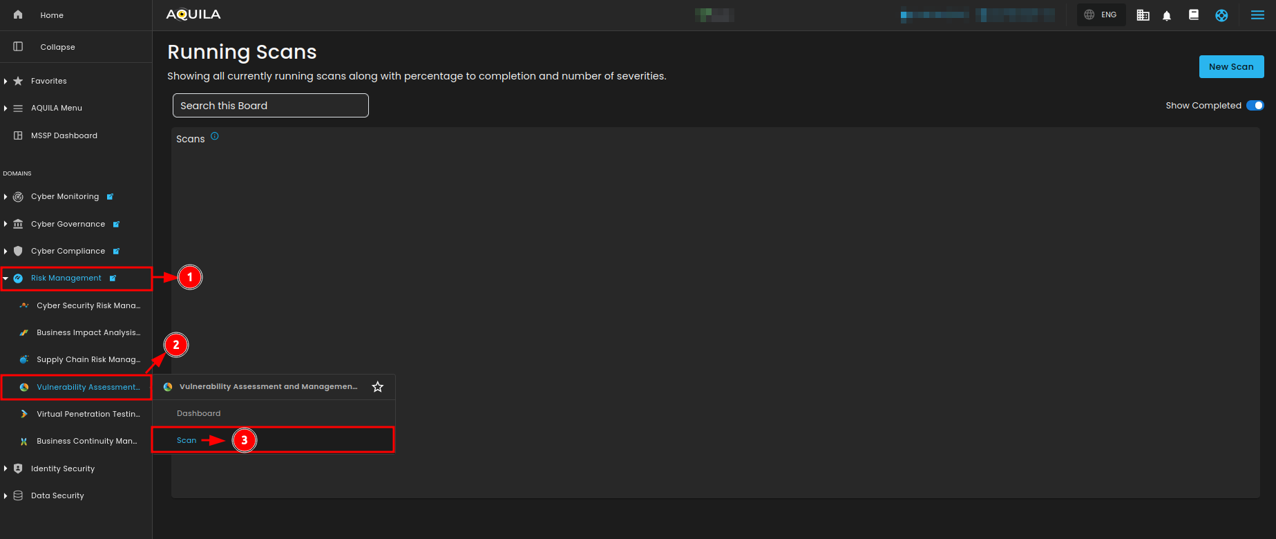 The Running Scans page in AQUILA shows all ongoing vulnerability scans with progress and severity details. From here, users can search scans, launch new ones, and toggle to view completed scans.
