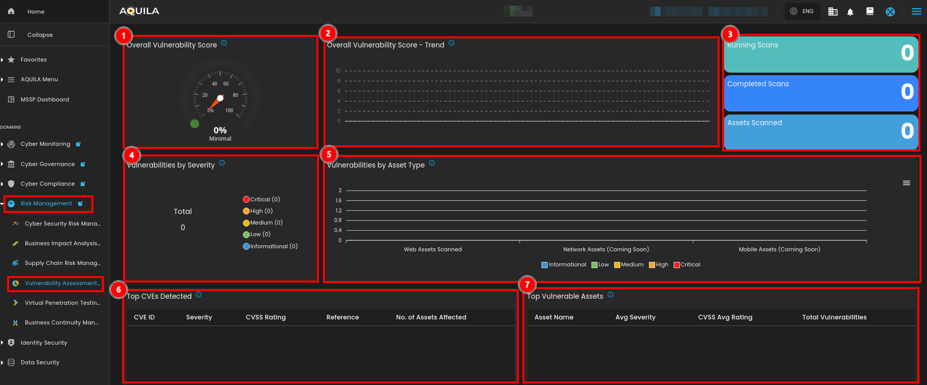 The Vulnerability Assessment & Management Dashboard in AQUILA provides a centralized view of all detected vulnerabilities. It shows the overall risk score, trends, severity distribution, and affected assets. Users can monitor scans, identify top vulnerabilities (CVEs), and track the most at-risk assets, enabling quicker prioritization and remediation.