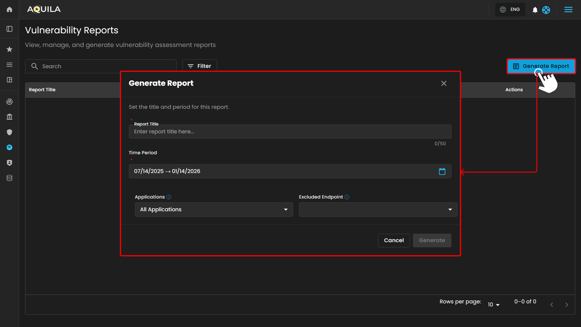 The Vulnerability Assessment & Management Dashboard in AQUILA provides a centralized view of all detected vulnerabilities. It shows the overall risk score, trends, severity distribution, and affected assets. Users can monitor scans, identify top vulnerabilities (CVEs), and track the most at-risk assets, enabling quicker prioritization and remediation.