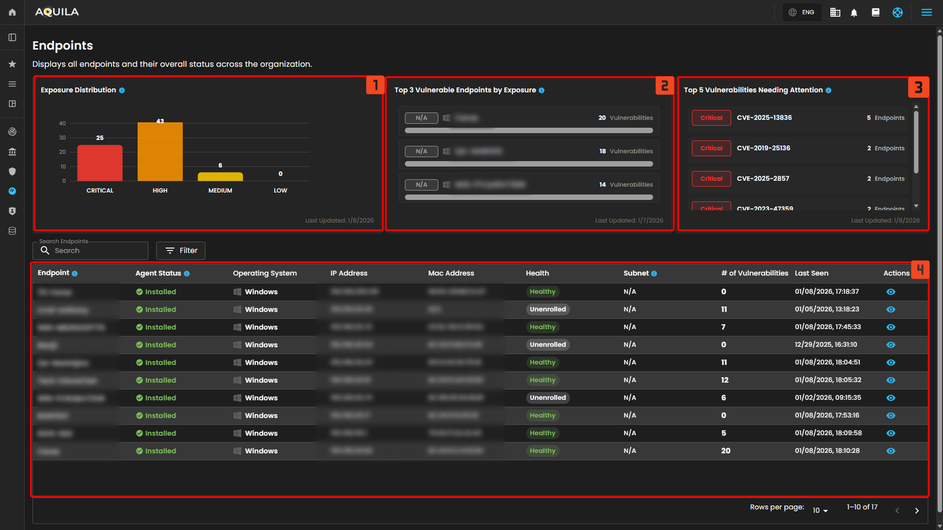 - Total Vulnerabilities - Displays the total number of detected vulnerabilities across all endpoints and their current mitigation status.