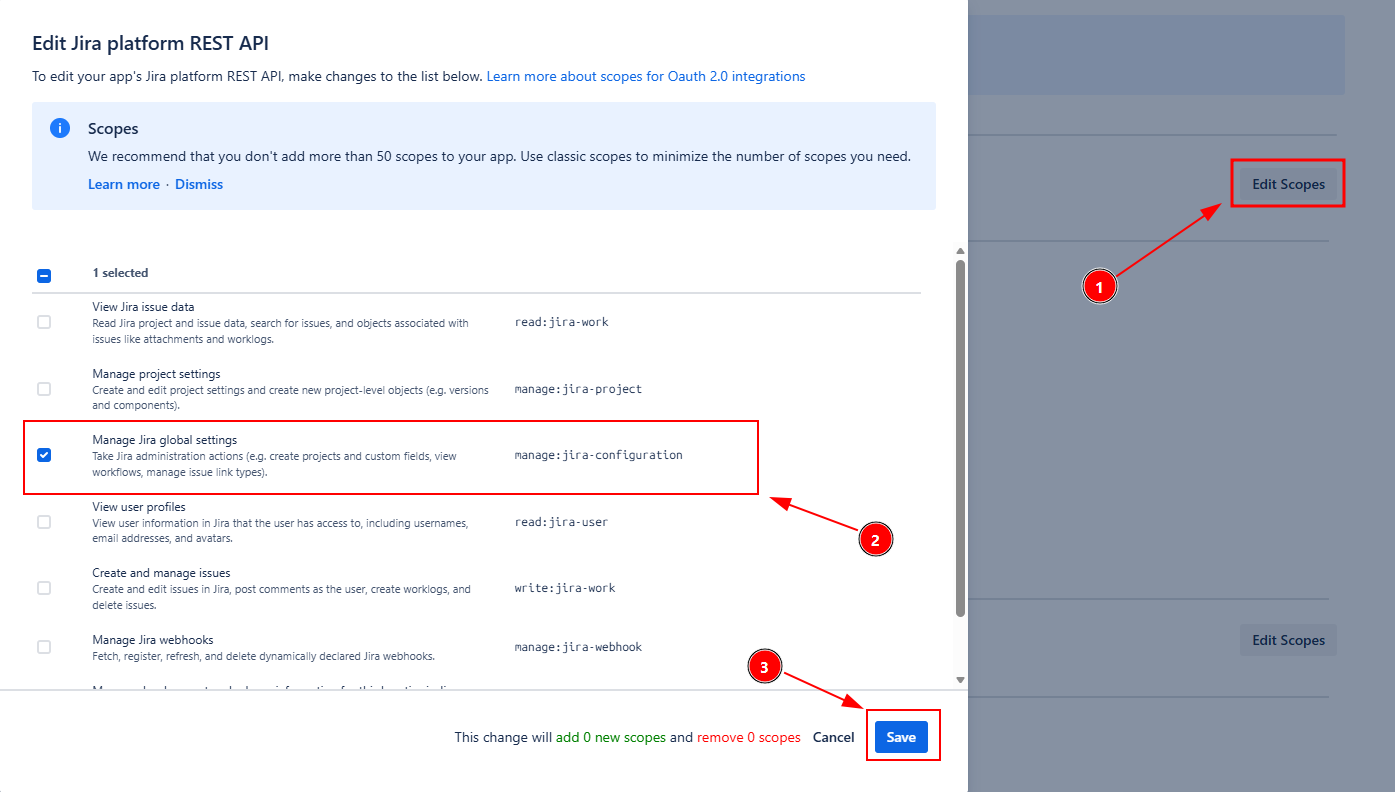 Select Classic or Granular scope Classic:manage:jira-configuration was selected in this example.