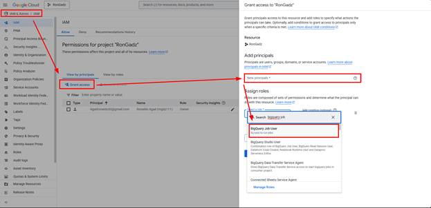 - Click Select a role, search for and select BigQuery Job User.