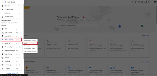 - In the Google Cloud console(external, opens in a new tab or window), navigate to APIs & Services > Library.