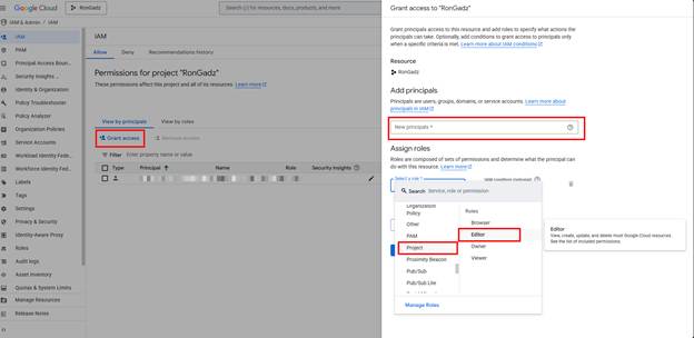 - Paste the service account email in the New principals field.