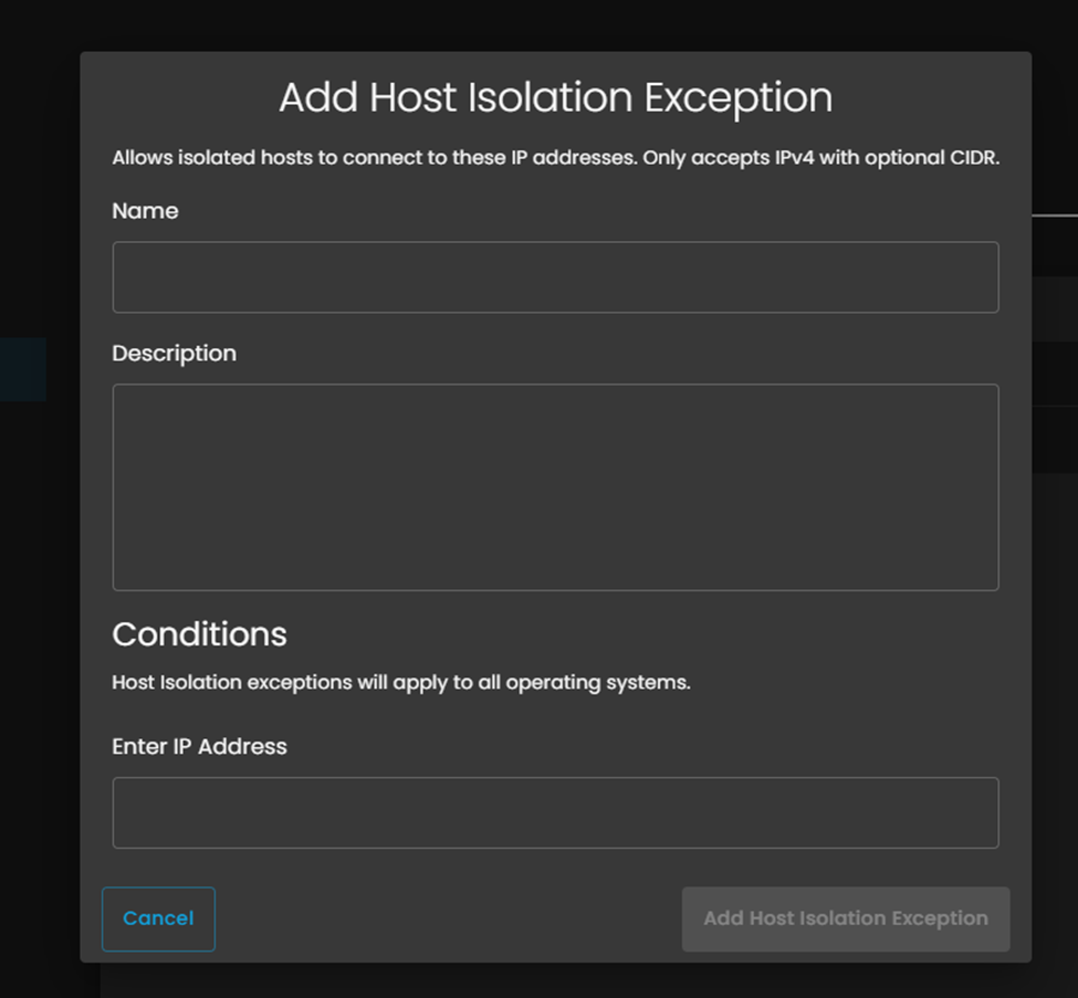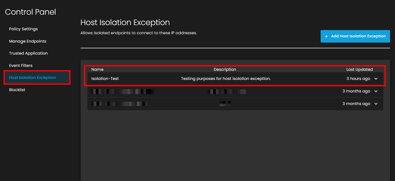 - Click the + Add Host Isolation Exception button (top right, blue button)