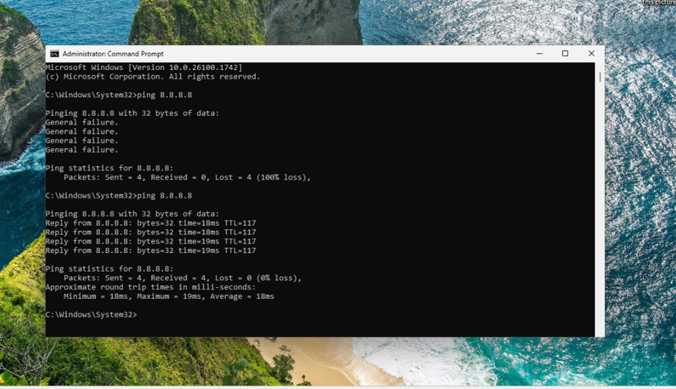 - Reply from 8.8.8.8: bytes=32 time=18ms TTL=117