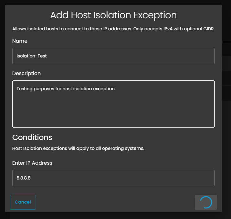 + Add Host Isolation Exception button (top right, blue button) - In the "Add Host Isolation Exception" dialog box, fill in the following fields: