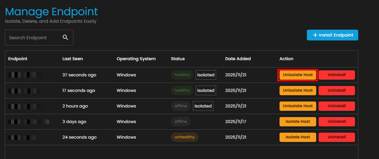 - The endpoint status will change to Isolated