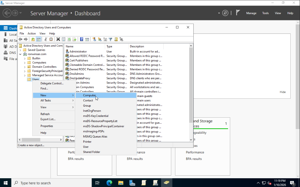 - On the Active Directory Users and Computers right click the Users folder select New and Computer.