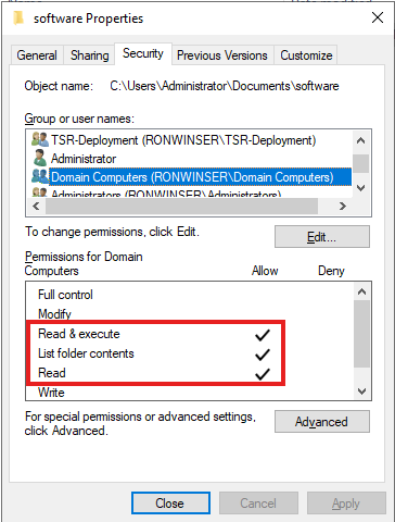 To ensure domain-joined computers can access the AQUILA EDR ZIP file package and folder for centralizing logs, create a shared network folder and configure appropriate permissions.