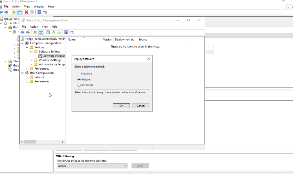 In this case, the setup of Active Directory Users and Computers and Group Policy Management for software deployment via Group Policy (GPO) has already been completed. The installer packages have also been added to Group Policy Management and are ready for deployment on the client end.