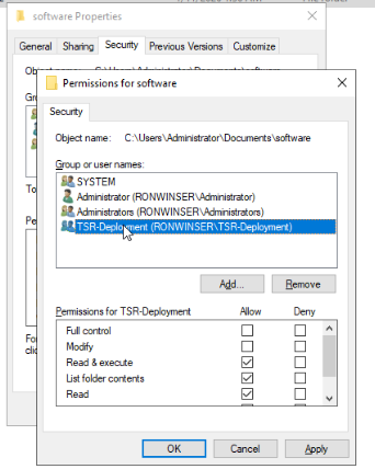 - On the Permission for software, click Add and type the Security Group name you created "tsr-deployment" and click the Check Names (It will automatically call the Security Group) and click OK.