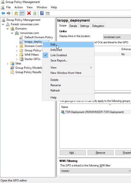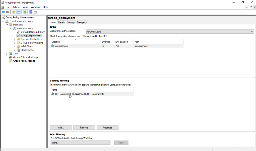 - Your TSR-Deployment which is the Global Security group you've created was already added on the Security Filtering. Kindly close the Group Policy Management or leave it open.
